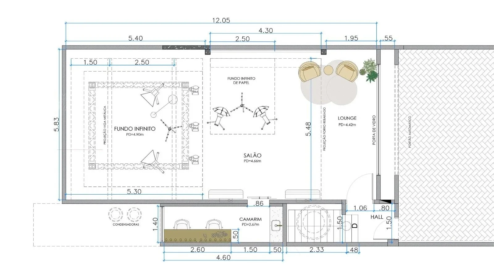 70m2 e 4,6m de pé direito (4m ate o grid)